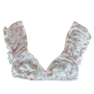 パフスリーブがかわいいノンワイヤーブラ。フロントにはリボン柄のレースがつきローズモチーフのリボンやディテールにこだわったアイテムになります。